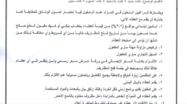 ويشترط للمشاركة في المزاد تقديم الوثائق الأصلية للمطابقة، إضافة إلى تأمين ابتدائي بنسبة 2-3% من قيمة العطاء، ترخيص مزاولة مهنة، سجل تجاري ساري المفعول، وكتابة السعر الإجمالي في ورقة عرض السعر الرسمي كما يجب تقديم برنامج زمني لنقل الخردة وبيان بالمعدات والمواد المستخدمة، وتقديم العطاء داخل مظروف مختوم بالشمع الأحمر بالريال اليمني.