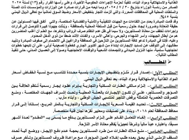 وشدد البيان على ضرورة إلغاء التعامل القائم بدفع ما يسمى بالمقدّم لعدة أشهر، باعتباره عبئًا ماليًا وشرطًا تعجيزيًا يفاقم معاناة الأسر، وكذلك منع ملاك العقارات من طرد المستأجرين بحجة تأخر السداد، مع مراعاة ظروفهم وتأخر صرف المرتبات والمساعدات الإنسانية.