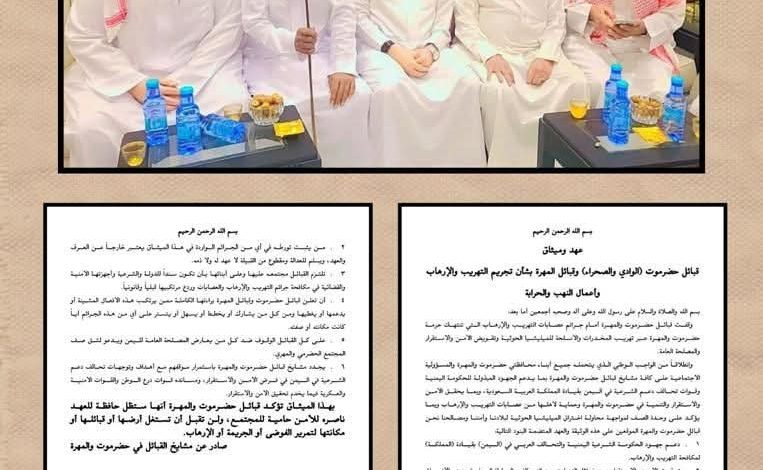 في خطوة تاريخية وقعت قبائل حضرموت والمهرة ميثاقا يؤكد على دعمها الكامل للحكومة اليمنية والتحالف العربي في مكافحة الإرهاب والتهريب، ووقعت على اتفاق تحت عنوان عهد وميثاق يمثل وثيقة وطنية تؤكد على وحدة الصف والوقوف خلف الشرعية في مواجهة محاولات اختراق الميليشيا الحوثية .