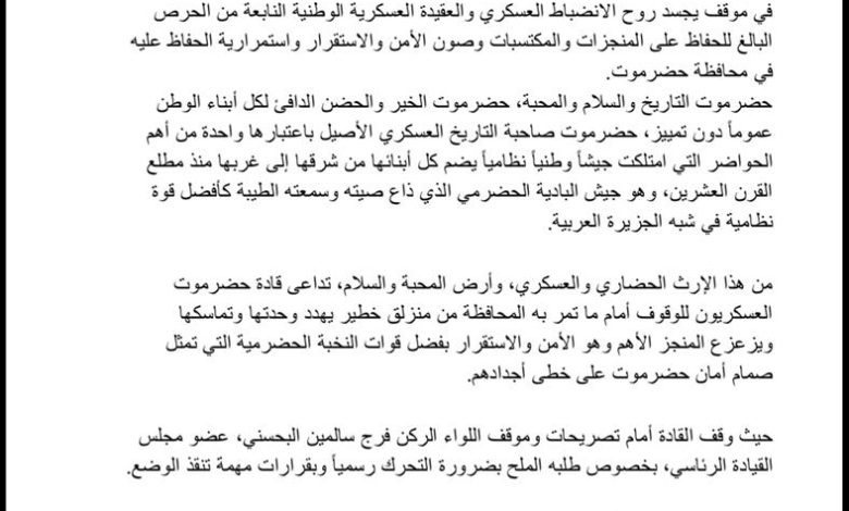 قادة عسكريون يالنخبة الحضرمية يعلنون تأييدهم لتصريحات اللواء البحسني (بيان)
