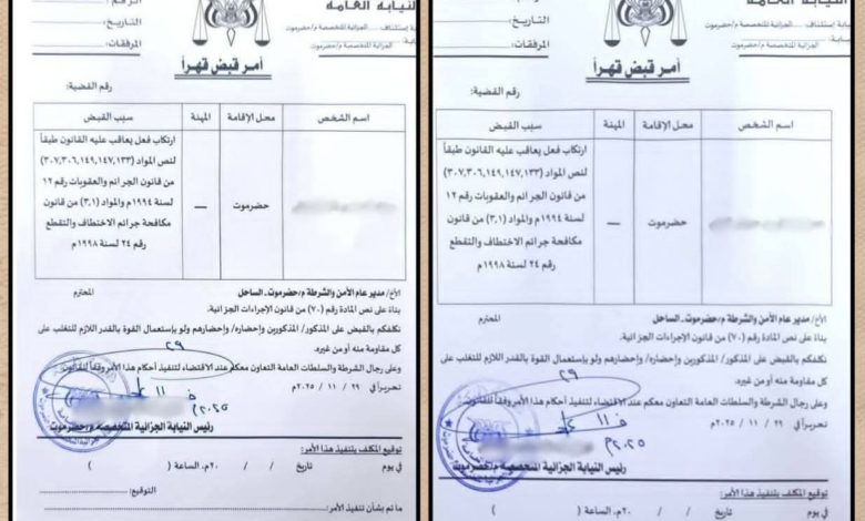 أصدرت النيابة الجزائية المتخصصة بمحافظة حضرموت أوامر بإلقاء القبض على الشيخ عمرو بن حبريش واللواء مبارك العوبثاني، بتهم ارتكاب جرائم الاختطاف والتقطع .