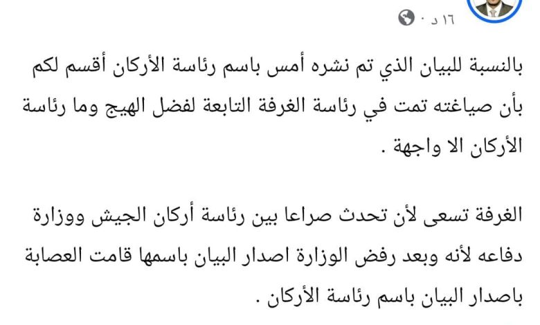 وأوضح سليمان أن الجهة التي تقف خلف البيان تسعى لخلق صراع مؤسسي بين رئاسة أركان الجيش ووزارة الدفاع، لافتًا إلى أنه وبعد رفض وزارة الدفاع إصدار البيان باسمها، جرى الالتفاف على ذلك الرفض بإصداره باسم رئاسة الأركان.