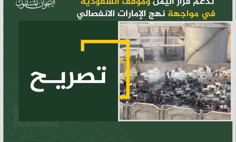 ‏وترفض الجماعة بشكل قاطع النهج المتهور الذي تتبناه دولة الإمارات العربية المتحدة، القائم على تغذية النزعات الانفصالية في المنطقة، وتسليح أطراف خارج إطار شرعية الدولة، وهو ذات الدور الذي تقوم به في ليبيا والسودان والصومال، وتستهدف به اليمن. وهي كلها تدخلات تهدد الأمن القومي المصري بصورة مباشرة في جواره الاستراتيجي وفي باب المندب والبحر الأحمر، في تقاطع مريب مع الأجندة الإسرائيلية التوسعية. ولذلك، فإن مصر مدعوة بدورها لاتخاذ كافة الإجراءات التي تحفظ أمنها القومي بالتنسيق مع الدول الرافضة لنهج التقسيم والانفصال.