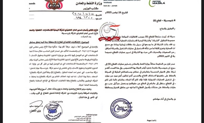 كشفت وثائق رسمية عن قيام الشركة اليمنية للاستثمارات النفطية والمعدنية (وايكم) بإصدار توجيهات بنقل تشغيل القطاع النفطي رقم (5) من شركة بترومسيلة الحكومية إلى شركة “جنة هنت” الخاصة، وذلك ابتداءً من 1 يناير 2025، رغم توجيهات رسمية سابقة من رئاسة الوزراء ووزارة النفط بإيقاف أي إجراءات من هذا النوع.